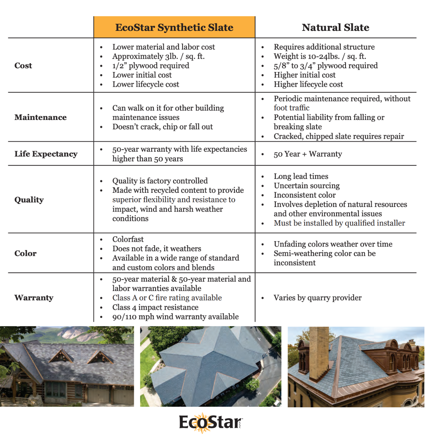 Perhaps one of the most appealing benefits of composite roofing is affordability, especially considering its longevity compared to other materials. Their wind, fire, and impact durability paired with their low maintenance and upkeep means that they represent an excellent ROI for the property owner’s investment. Some synthetic slate and shake manufacturers, such as EcoStar, offer a 50-year warranty.