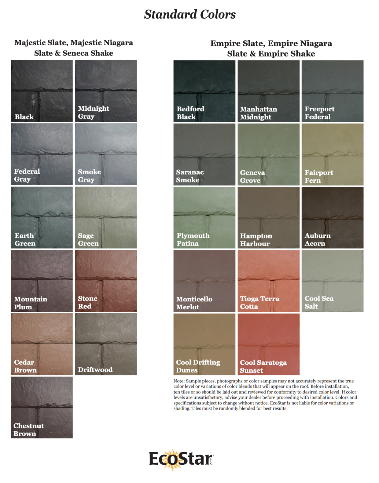 The Majestic Niagara design consumes less raw material, reduces roof load by up to 20% and lowers installation labor by 30%. Unlike other synthetic slates, Majestic Niagara Slate is manufactured from up to 80% post-industrial recycled materials. Ecostar roofing tiles, including the larger Majestic Niagara Slate, provide long-lasting durability, superior protection against extreme weather conditions and 50 years of warranty coverage. Available in 11 standard colors, Majestic Niagara Slate offers endless opportunity to showcase the beauty of natural slate at a fraction of the cost.