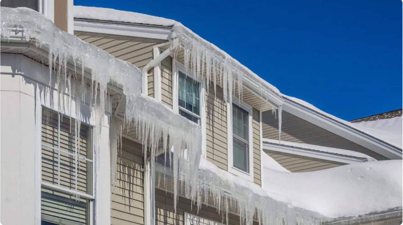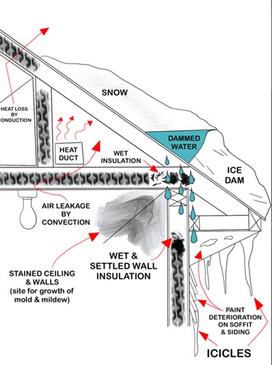 An ice dam is a wall of ice that forms at the edge of your roof. They usually form at the gutters or sofits. When ice dams form, the water often backs up behind the ice dam and creates a pool. This pool of water can leak into your home and cause damage to walls, ceilings, insulation and other areas. Depending on the amount of ice, it can potentially damage the exterior of your home. In some severe situations, the buildup of ice can cause damage to the interior of your home.